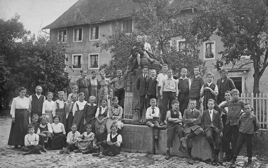 Schülerreise der Sekundarrschule 1916, fotografiert vom Sekundarlehrer Ueli Weber. Links neben dem Brunnen stehend zur Unterstützung des Lehrers mit dabei, obwohl sie schon aus der Schule sind: Gertrud / Trudi Volkart, Lisa Bänninger, Margrit Fritschi. Links aussen stehend weitere Helfer (Namen unbekannt).