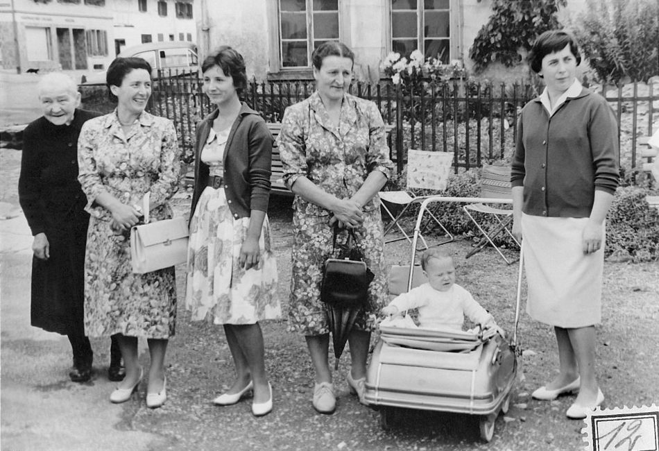 Vor der Schmiede beim Umzug 1965. Personen? Vorgärten, Kinderwagen.