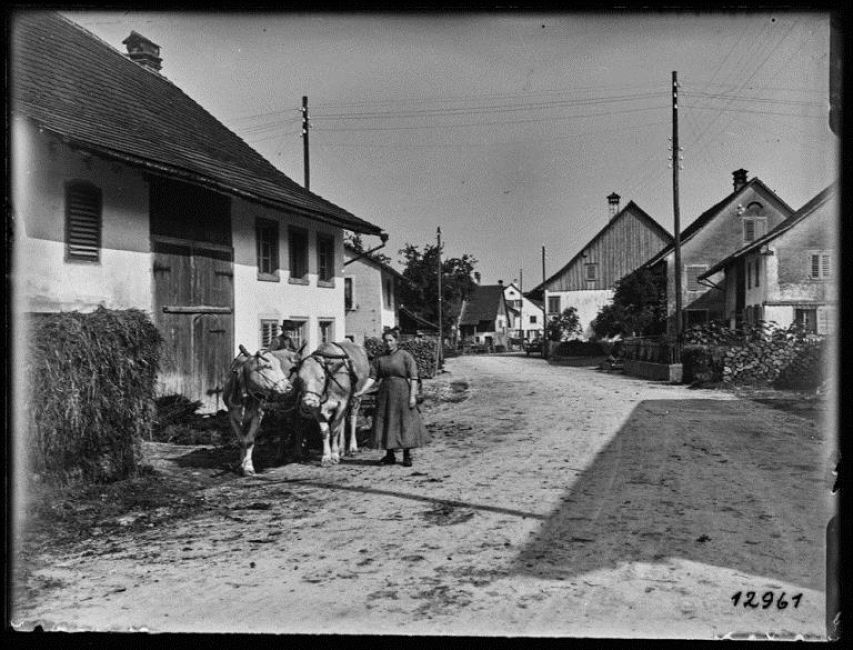 Oberdorf. Bäuerin und Bauer mit Kuh, Kuhgespann. Miststöcke.