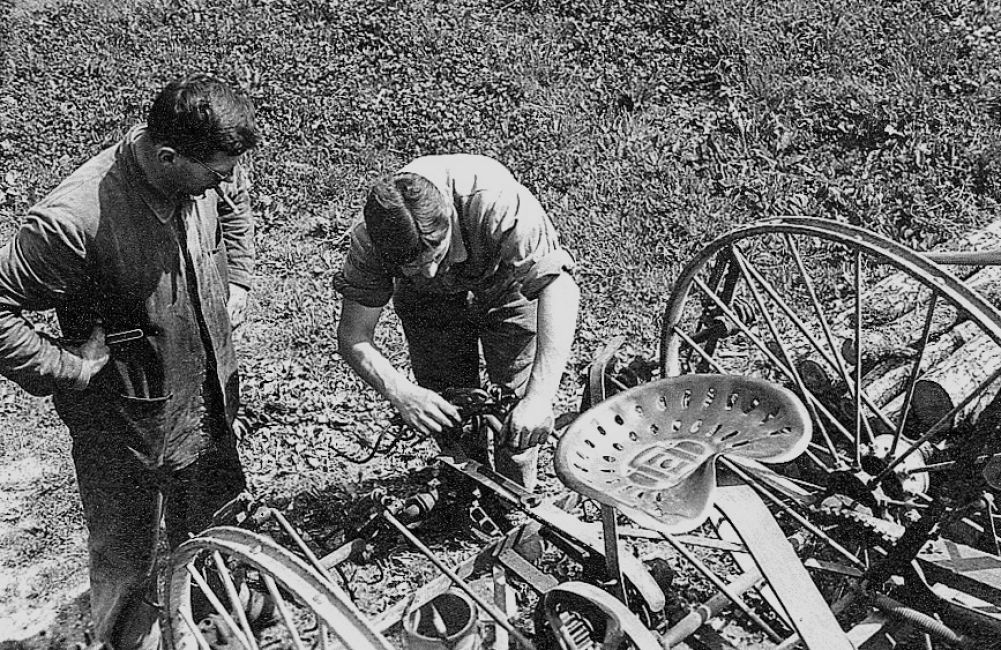 Kommentar Jakob Menzi: Das ist ein Heuwender, er wurde gebraucht um das gemähte Gras zu wenden. Man brauchte ihn aber auch zum Gras/Heu zetten. Das gemähte Gras wurde von Hand verzettelt und nachher, wenn vorhanden, mit dem Heuwender gewendet, ansonsten von Hand mit der Gabel.