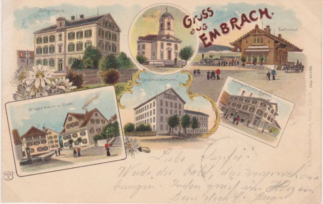 Postkarte aus dem Verlag Künzli, Zürich. Schulhaus, Bahnhof, Handlung Fritsche