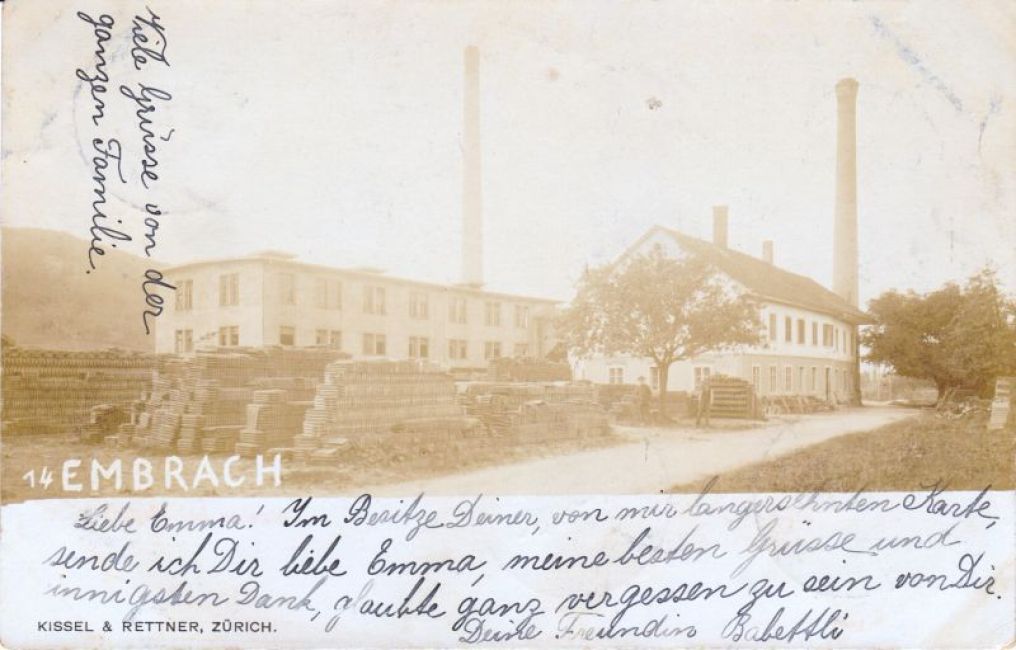 Röhrenfabrik Ganz im Riet, ca. 1905 (heute Zimmerei Bächi). Die glasierten Ziegel stapeln sich. Postkarte aus dem Verlag Kissel und Rettner, Zürich.