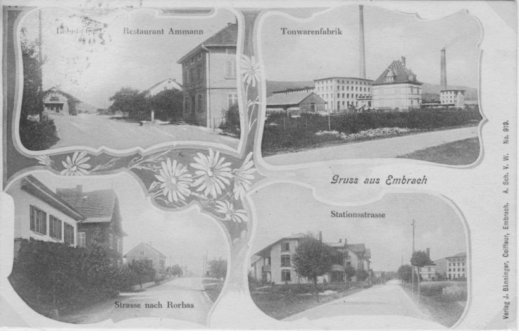 Stationsquartier 1910: Stationsstrasse, Steinzeugfabrik, Restaurant Ammann, Bahnhof, Rheinstrasse. Verlag J. Bänninger, Coiffeur, Embrach