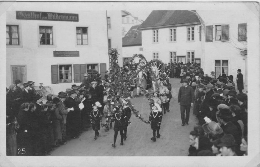 Dorffest ca. 1920. Restaurant zum Wilden Mann, altes Gemeindehaus. Restaurant Linde. Postkarte.
