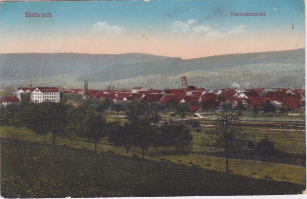 Oberdorf 1922. Kirche, links die Seidenzwirnerei. Postkarte.