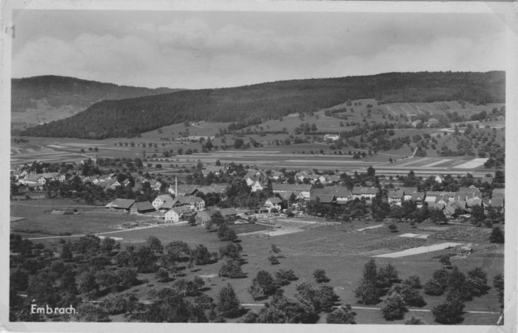 Unterdorf 1935. Ganz links Ofenfabrik Ganz, Mitte links Zimmerei Bächi (früher Röhrenfabrik Ganz). Postkarte.