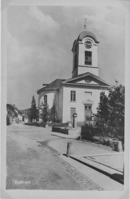Kirche 1948. Brunnen vor der Schmiede. Rechts die Plattform der Waage der landwirtschaftlichen Konsumgenossenschaft. Postkarte.