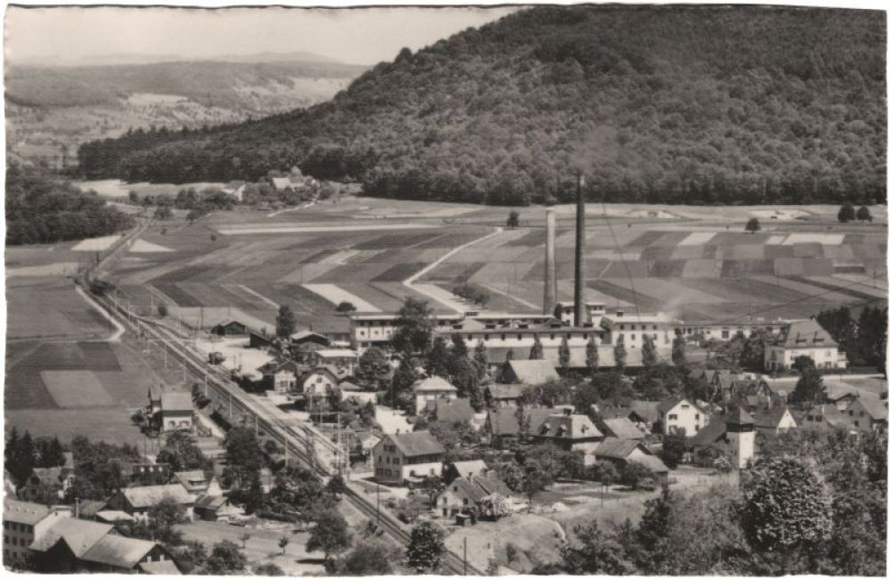 Stationsquartier 1949 mit Steinzeugfabrik und Bahnhof. Links unten angeschnitten Töpferei Landert, rechts die katholische Kirche. Postkarte.