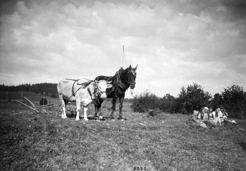 Pflügen, Ackern. Znünipause bei der Feldarbeit. Pferde, Kühe.
