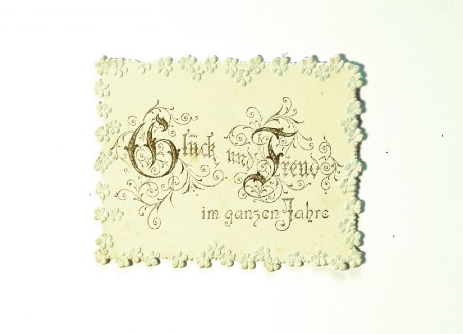 Glückwunsckarte zum neuen Jahr ca. 1895. Auf der Rückseite: Familie Kleiner