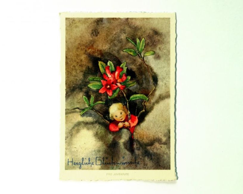 Glückwunschkarte pro Juventute ca. 1920. Auf der Rückseite: Familie Lüthi-Bachmann Embrach