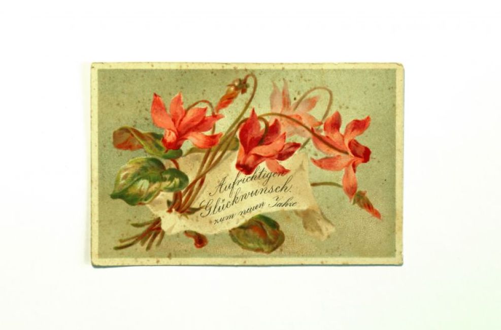 Glückwunschkarte zum Neuen Jahr. Auf der Rückseite: Emmy Fritschi.