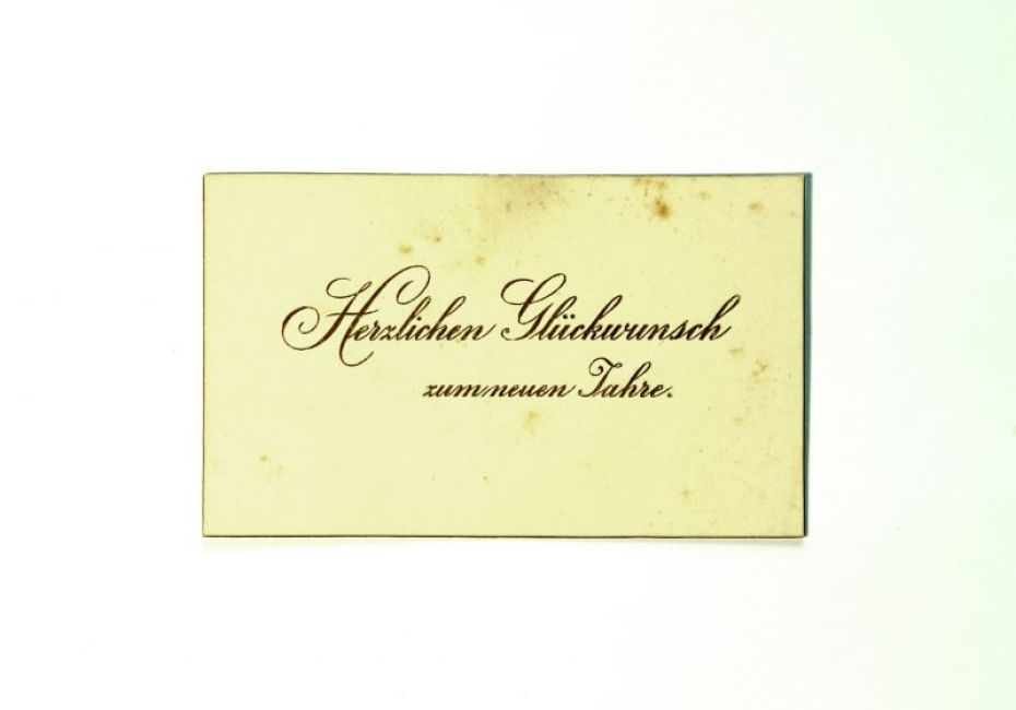 Glückwunschkarte zum Neuen Jahr. Auf der Rückseite: Emmy