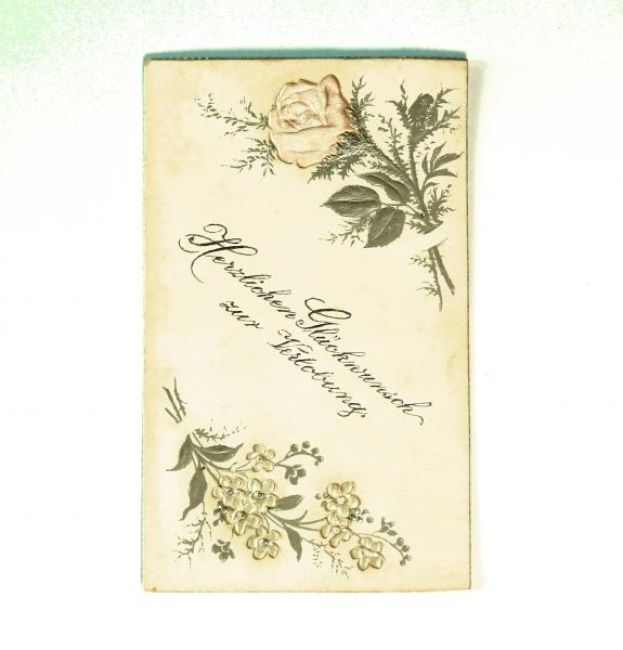 Glückwunschkarte zur Verlobung von Mina Bergmeier und Georg Volkart 1894. Auf der Rückseite: Eduard Ganz