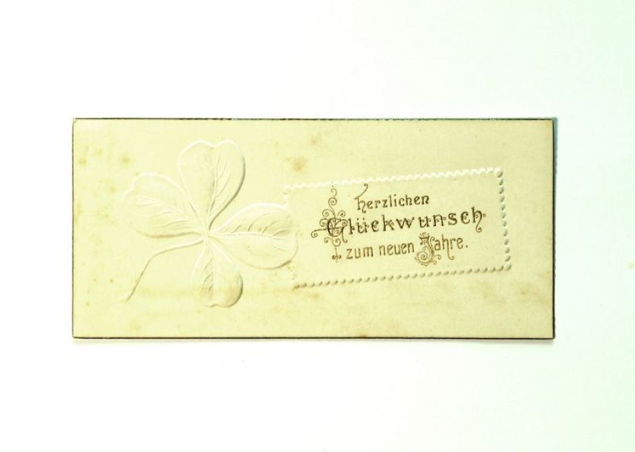 Glückwunschkarte zum Neuen Jahr. Auf der Rückseite: Karoline Hug
