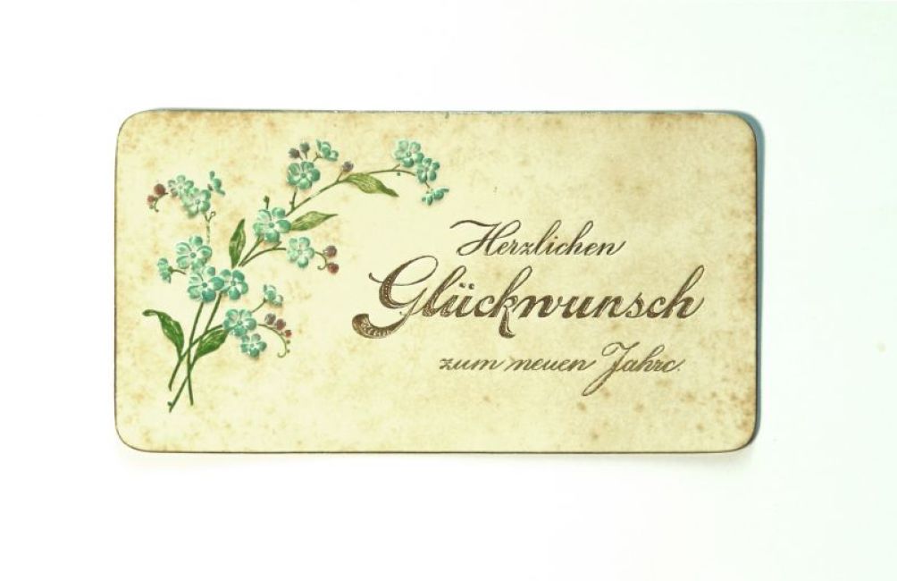 Glückwunschkarte zum Neuen Jahr. Auf der Rückseite: Familie Kleiner