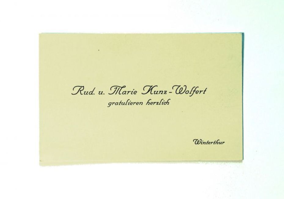 Glückwunschkarte, wsch. zur Hochzeit von Gertrud Volkart und Otto Zinggeler. Rudolf und Marie Kunz-Wolfert