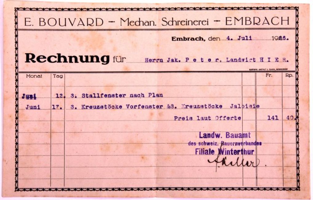 Schreinerei Bouvard. Neubau Stall des Jakob Peter, Hungerbühlstr. 15: Stallfenster, Kreuzstöcke der Vorfenster