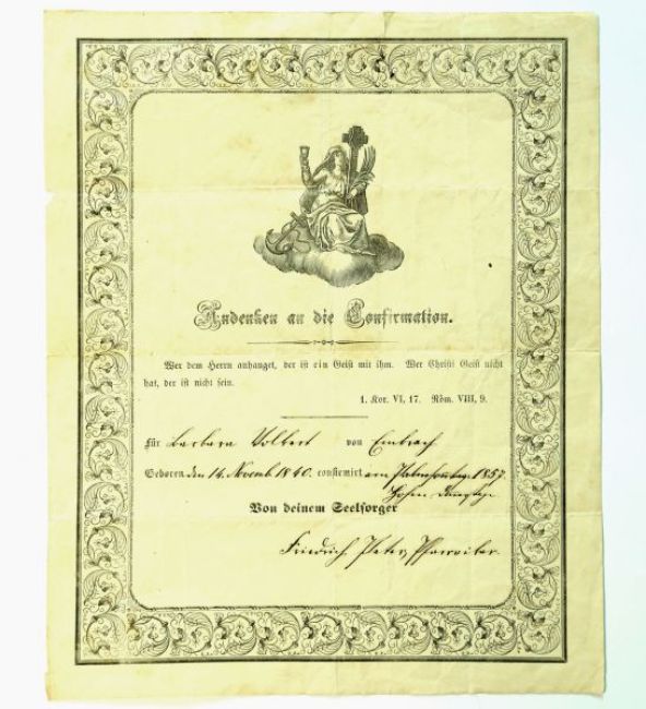 Andenken an die Konfirmation von Barbara Volkart von Embrach (1840-1922), Seelsorger Friedrich Peters (?) Pfarrwiler.