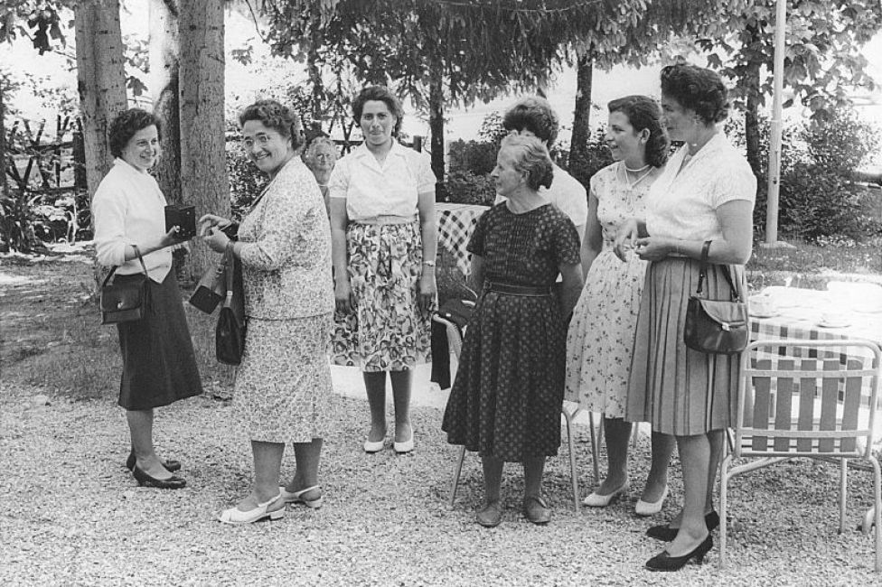 Personal der Seidenzwirnerei Zinggeler in Embrach ca. 1960: Von links nach rechts: Tochter von Frau Moser (verh. Buff), Frau Lindenmüller,