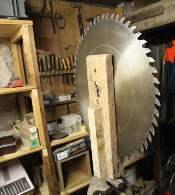 Das Fräseblatt der fahrbaren Brennholzfräse ist zum Schleifen eingespannt. Oberdorfstrasse 26. Aufnahme von 2017