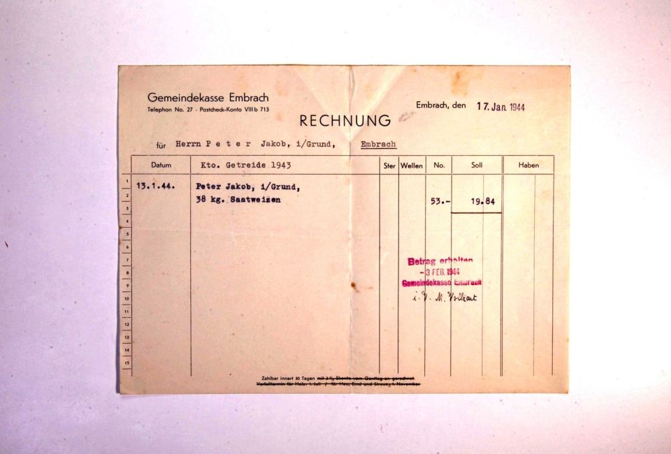 Während des Krieges kommt der Saatweizen von der Gemeinde. Buch WS 102. Quelle: Familienarchiv Peter. Buch WS 102.