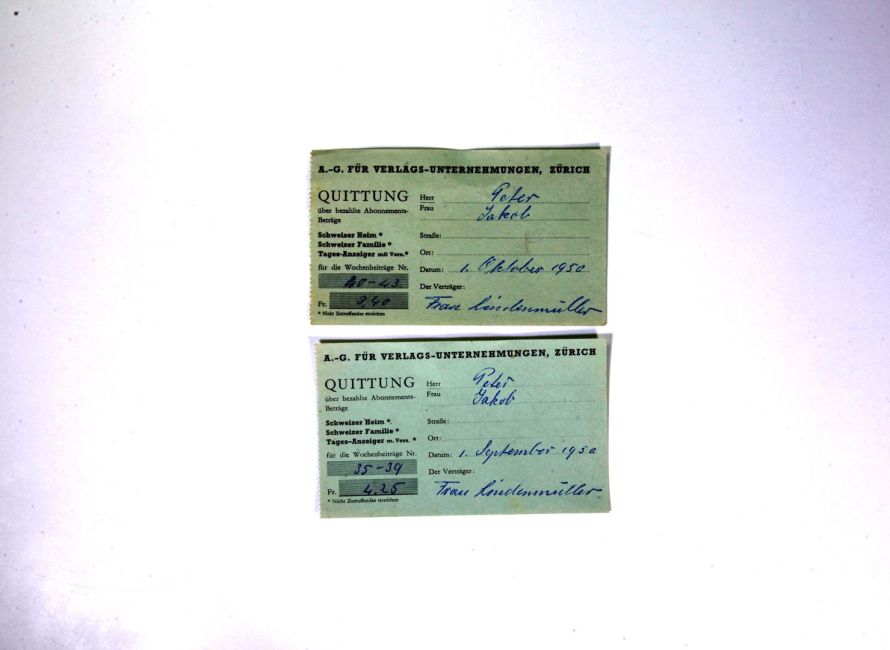 Frau Lindenmüller trägt Zeitungen aus: Tages-Anzeiger, Schweizer Familie, Schweizer Heim. Buch Seite 185. Quelle: Familienarchiv Peter.