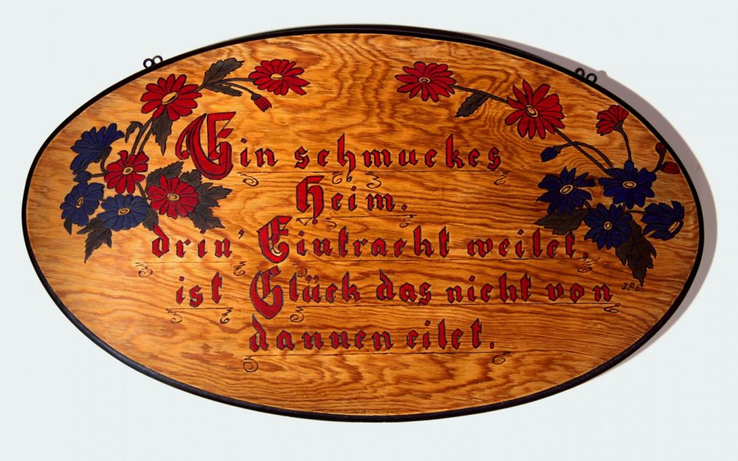 Brandmalerei ca. 1944 von Jakob Peter senior. Segensspruch zur Hochzeit.