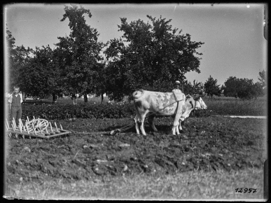 Eggen mit Kuhgespann in Embrach ca. 1920