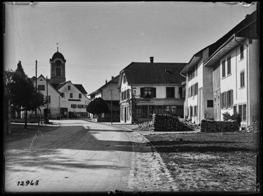 Dorfstrasse mit Holzbeigen. Kirche, Restaurant Linde. Rechts hinten Buchbinderei Fischer und Handlung für Herrenwäsche und Damenwäsche.