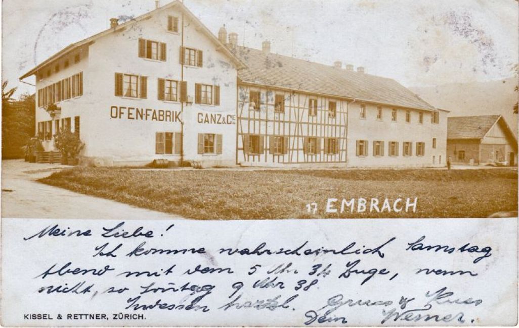 Ofenfabrik Ganz Dorfstrasse 107, ca. 1905. Fabrikarbeiter an den Fenstern. Postkarte aus dem Verlag Kissel und Rettner, Zürich.