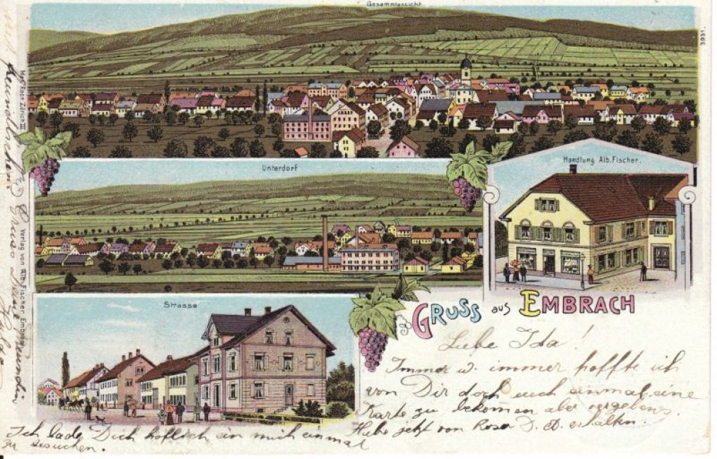 Postkarte ca. 1904 aus dem Verlag Albert Fischer, Handlung, Dorfstrasse 5. Unterdorf mit Röhrenfabrik Ganz (Vorläufer der Steinzeugfabrik)