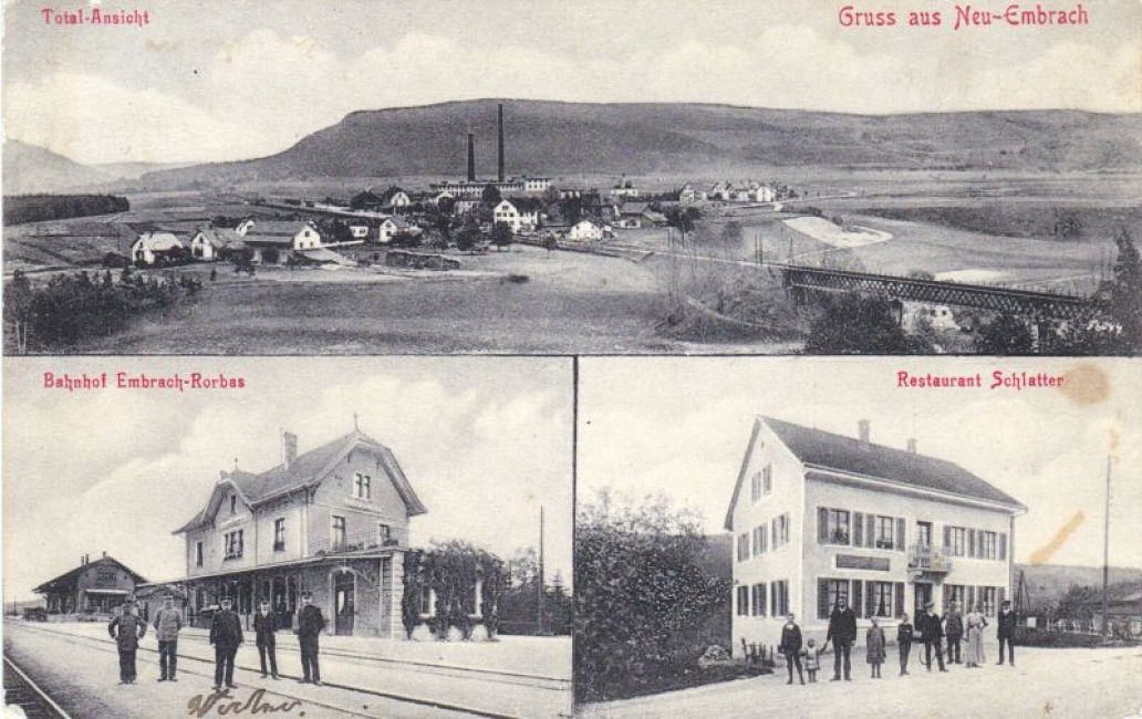 Stationsquartier 1917. Auf dem oberen Bild links Töpferei Landert. Bahnhof. Steinzeugfabrik. Unten links Bahnhof mit viel personal, Unten rechts Restaurant Schlatter. Postkarte.