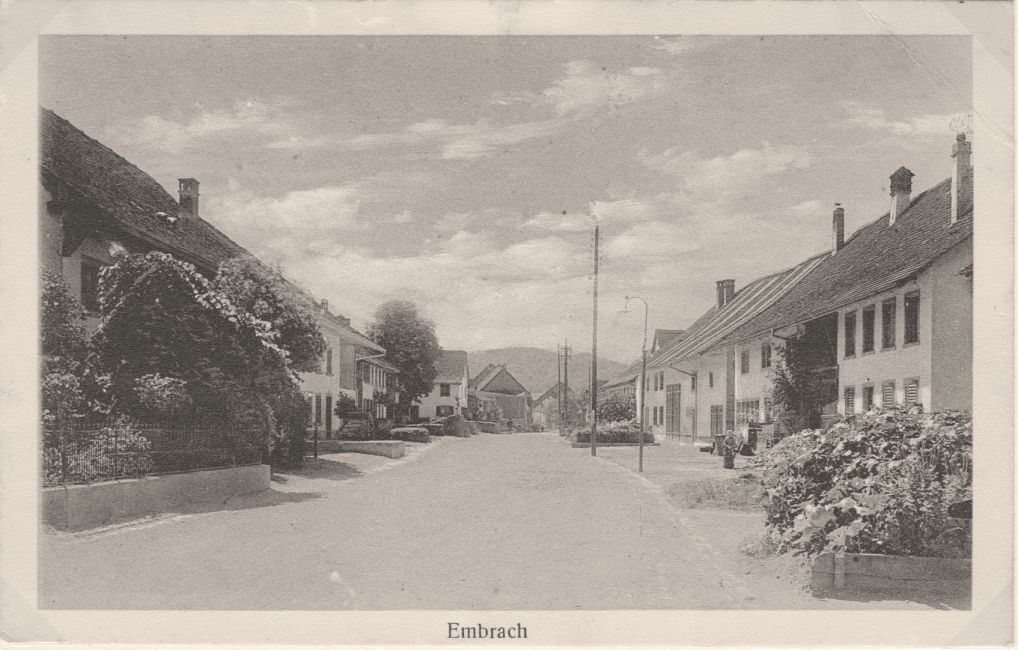 Hintergasse /Zürcherstrasse Richtung Süden ca. 1920. Vorgärten, Miststöcke, Strommasten, Strassenlaternen. Frau mIt Krätze. Postkarte