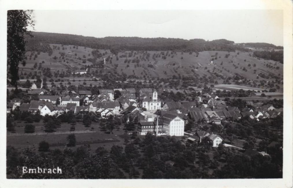 Oberdorf 1950. Kirche und Seidenzwirnerei. Postkarte.