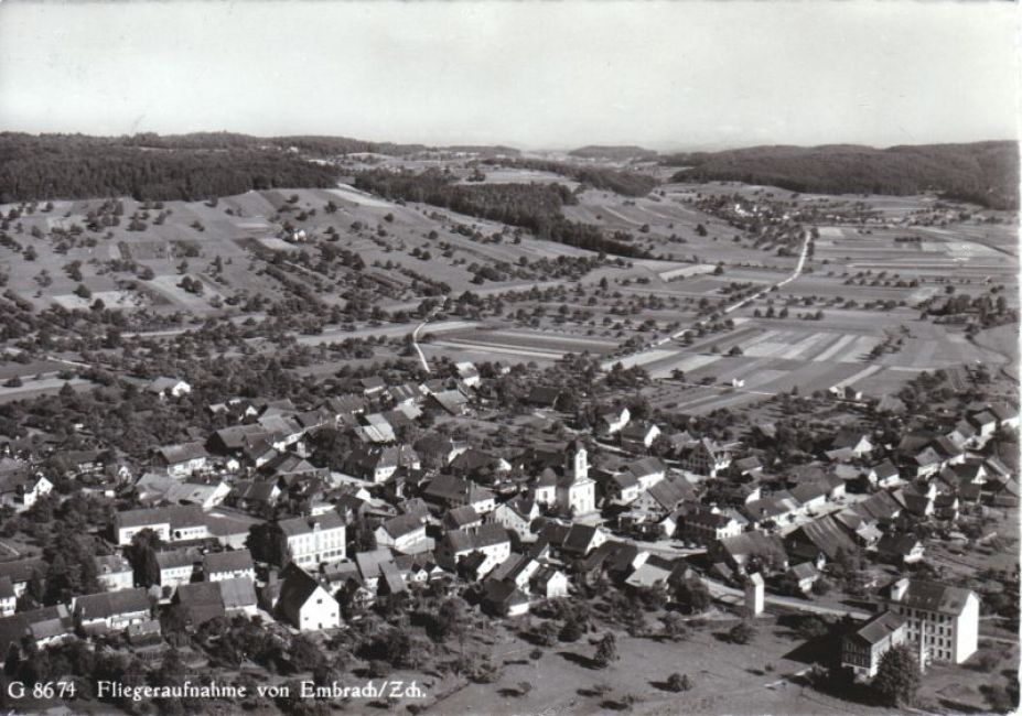 Oberdorf 1956. Rechts die Seidenzwirnerei. Postkarte.