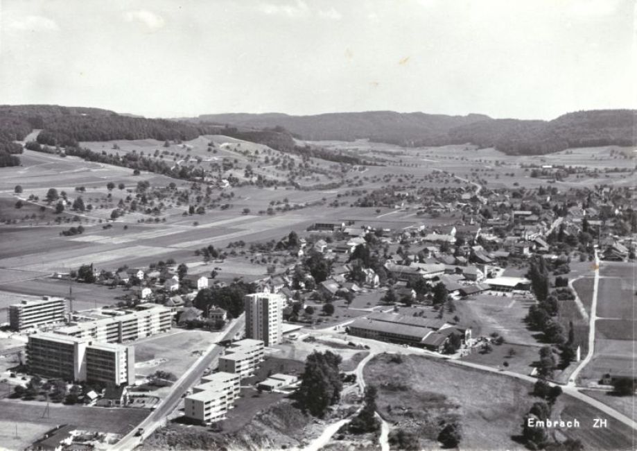 Unterdorf 1965: Links SILU, rechts davon Plättlifabrik Ganz (heute Migros). Postkarte.<vr>Quelle: Sammlung Hans Baer