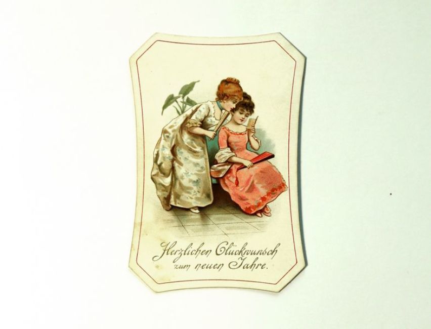 Glückwunschkarte zum Neuen Jahr 1889. Auf der Rückseite: Alfred Ganz 1889 Embrach